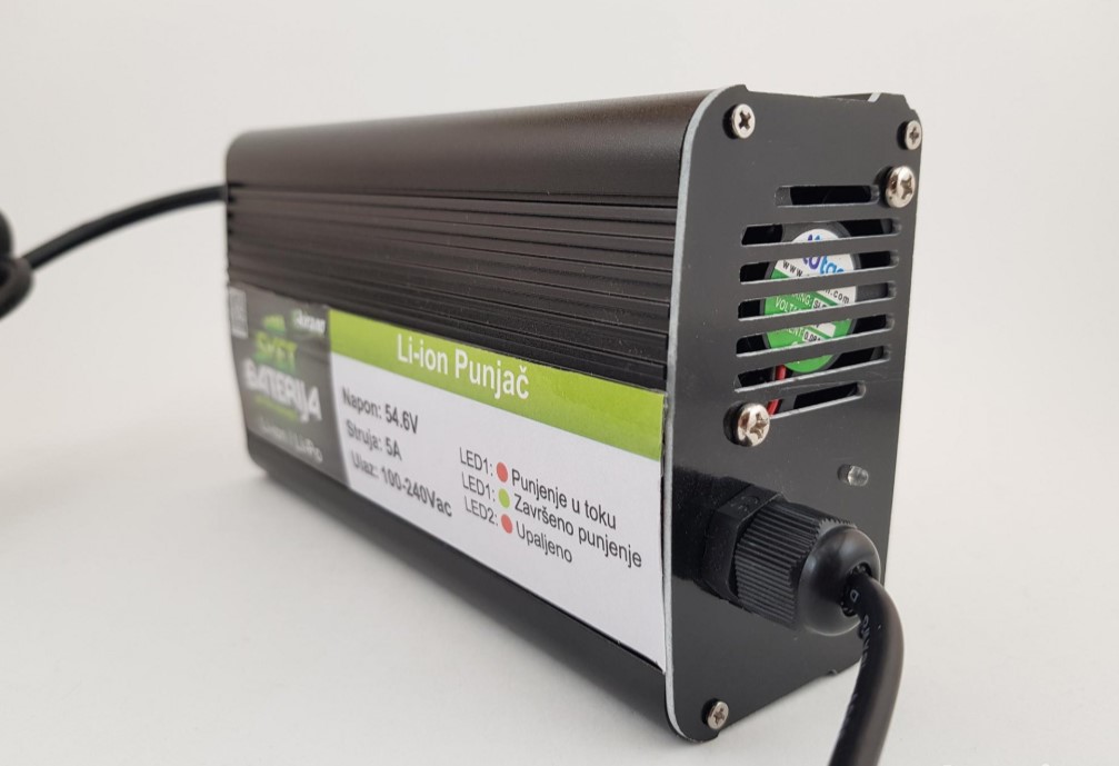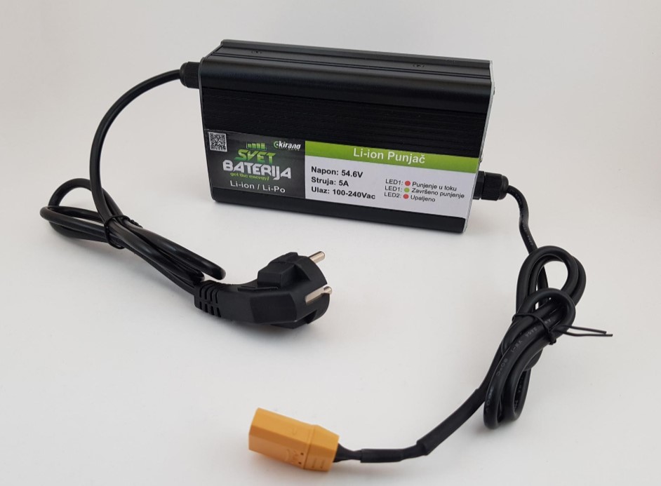 54.6V 5A li-ion punjač za električni bicikli, električni skuter, ebike i slična električna vozila koja koriste 18650 3.6V vezane serijski sa ukupnim nominalnim naponom od 48V. Punjač poseduje zaštitu od kratkog spoja, obrnutog polariteta i prepunjavanja, takođe poseduje ventilator za hlađenje komponenti prilikom punjenja, što je sigurna zaštita od pregrevanja!