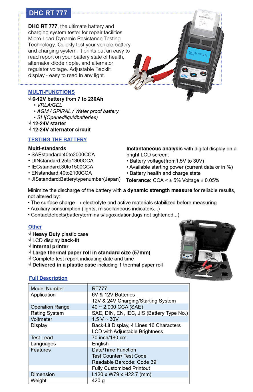 Robustan DHC RT777 profi tester akumulatora. Mogućnost testiranja svih takozvanih suvih baterija VRLA/GEL/AGM/SPIRALNE i baterija sa tečnim elektrolitom napona 6V/12V i kapaciteta od 7Ah do 230Ah. Testiranje startne struje bez potrebe za skidanjem klema sa akumulatora  12V i 24V. Testiranja struje alternatora tj. ispitivanje da li se akumulator puni. Čak i veoma pre pražnjene baterije do 1,5V mogu biti testirane sa ovim DHC RT777 profi testerom. Veliki LCD display, ugrađen štampač sa rolnama standrardne veličine 57cm, kompletan test sa datumom i vremenom testiranja i sve u plastičnoj kutiji lako prenosiv.