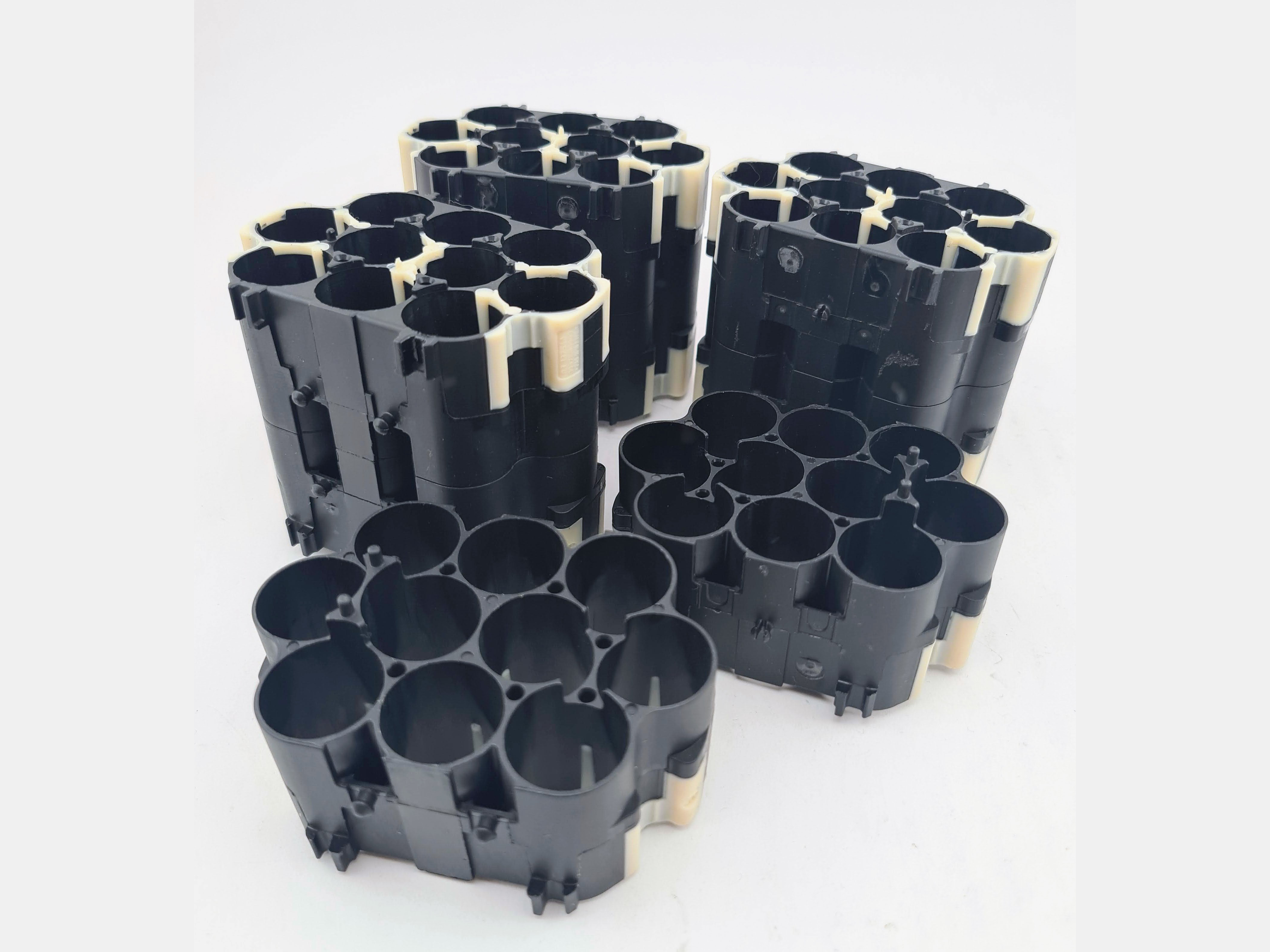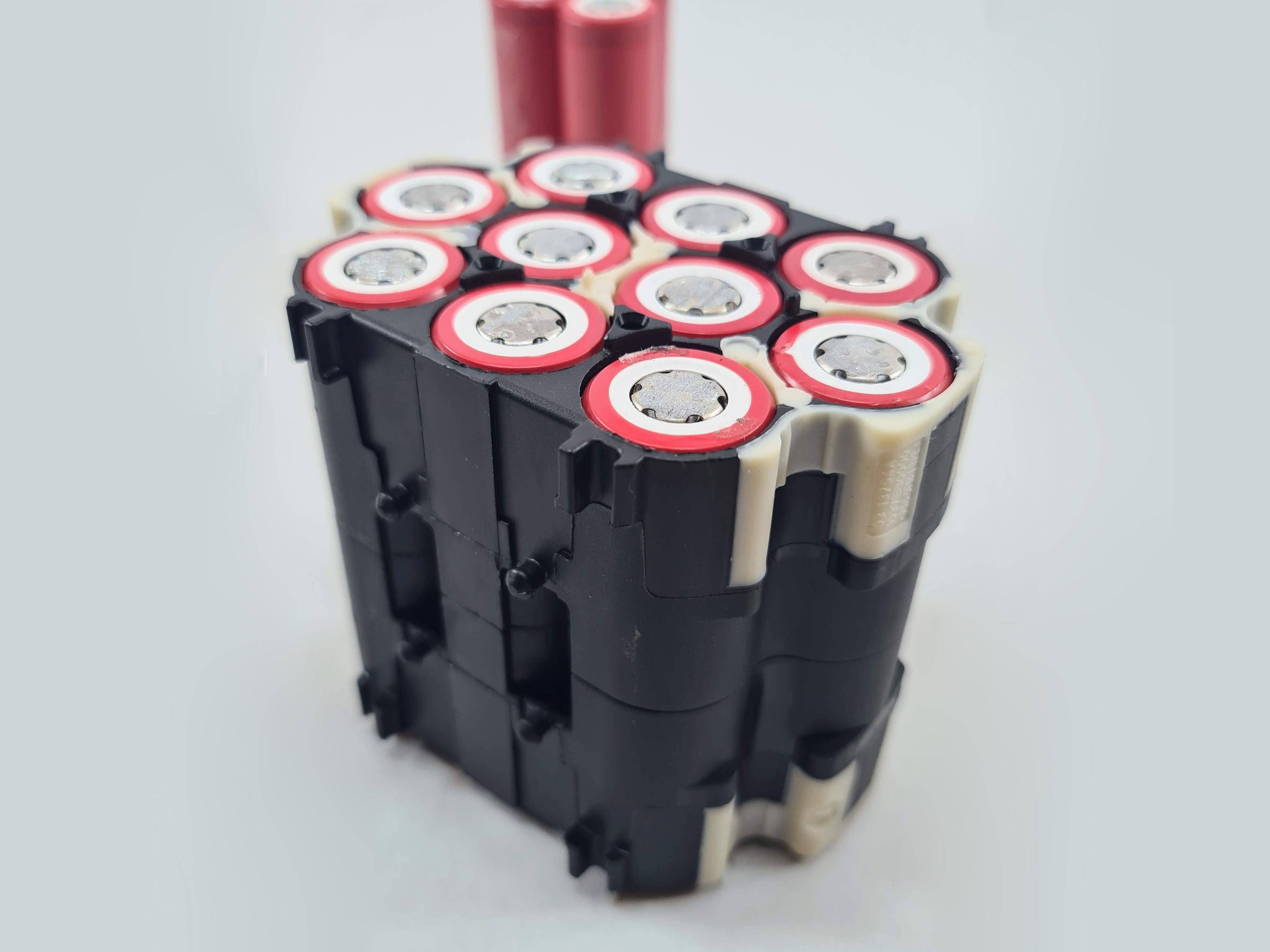 Kvalitetni plastični nosač baterija za 10 x 18650 litijum jon baterija, koristi se za povezivanje više baterija i sklapanje baterijskih paketa. Nosač ima ležišta na svojim stranama pomoću kojih se mogu spojiti više istih nosača u zavisnosti od potreba litijum jon paketa baterija, kao što je prikazano na slikama.