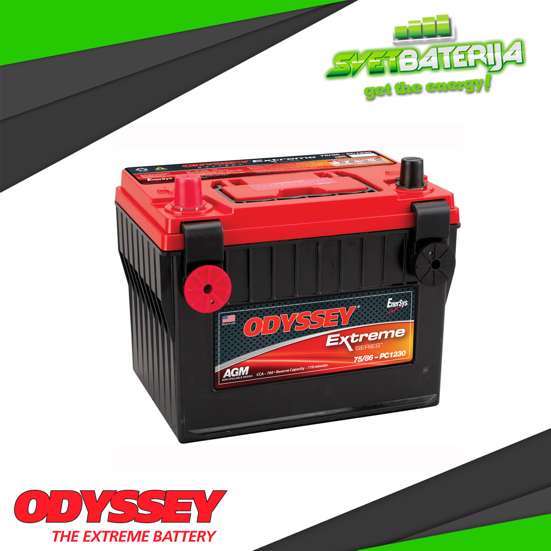 Odyssey PC1230DT baterija namenjena je za korišćenje u vozilima za ekstremne sportove. Otporna je na promene spoljne temperature i stalno pomeranje. Izlazna struja u prvih 5 sekundi startovanja (PHCA) iznosi 1230A na temperaturi od 26.7 C° dok je izlazna struja na 30 sekundi (CCA) 760A na temperaturi -17.8C°. Broj minuta u pražnjenju baterije od 25 ampera do napona 1.75V po ćeliji tj. 10.5V za 12V bateriju pri temperaturi od +26.7C°.