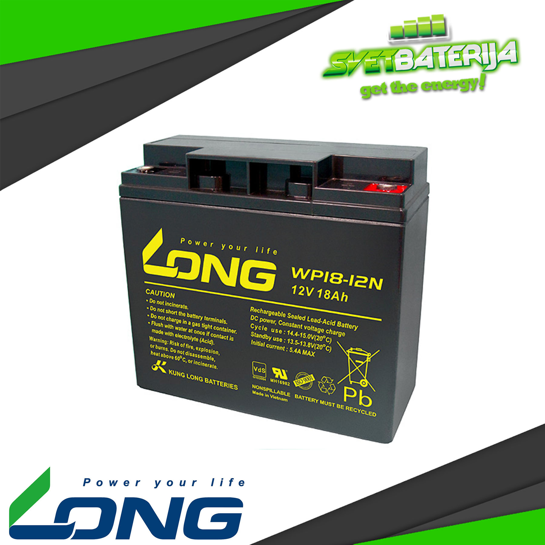 Kompanija Kung Long Batteries se bavi proizvodnjom i prodajom olovnih baterija na Tajvanu. Njihovi proizvodi obuhvataju AGM i Gel baterije, kao i druge tipove duboko cikličnih baterija. Long baterija 12V 18Ah pod oznakom WP18-12N je specijalna baterija dimenzija 181x75x167 mm, koja za razliku od drugih baterija ovog napona i kapaciteta može da obezbedi veće struje pražnjenja. Idelna za UPS uređaje. Ova baterija obezbeđuje dug životni vek u uređajima kao što su busteri, solarni uređaji, alarmne centrale, reflektori, dečije igračke, prskalice, kosačice, lampe, čobanice (pastirice) i druge uređaje gde se traži suva baterija sličnih dimenzija ili karakteristika.