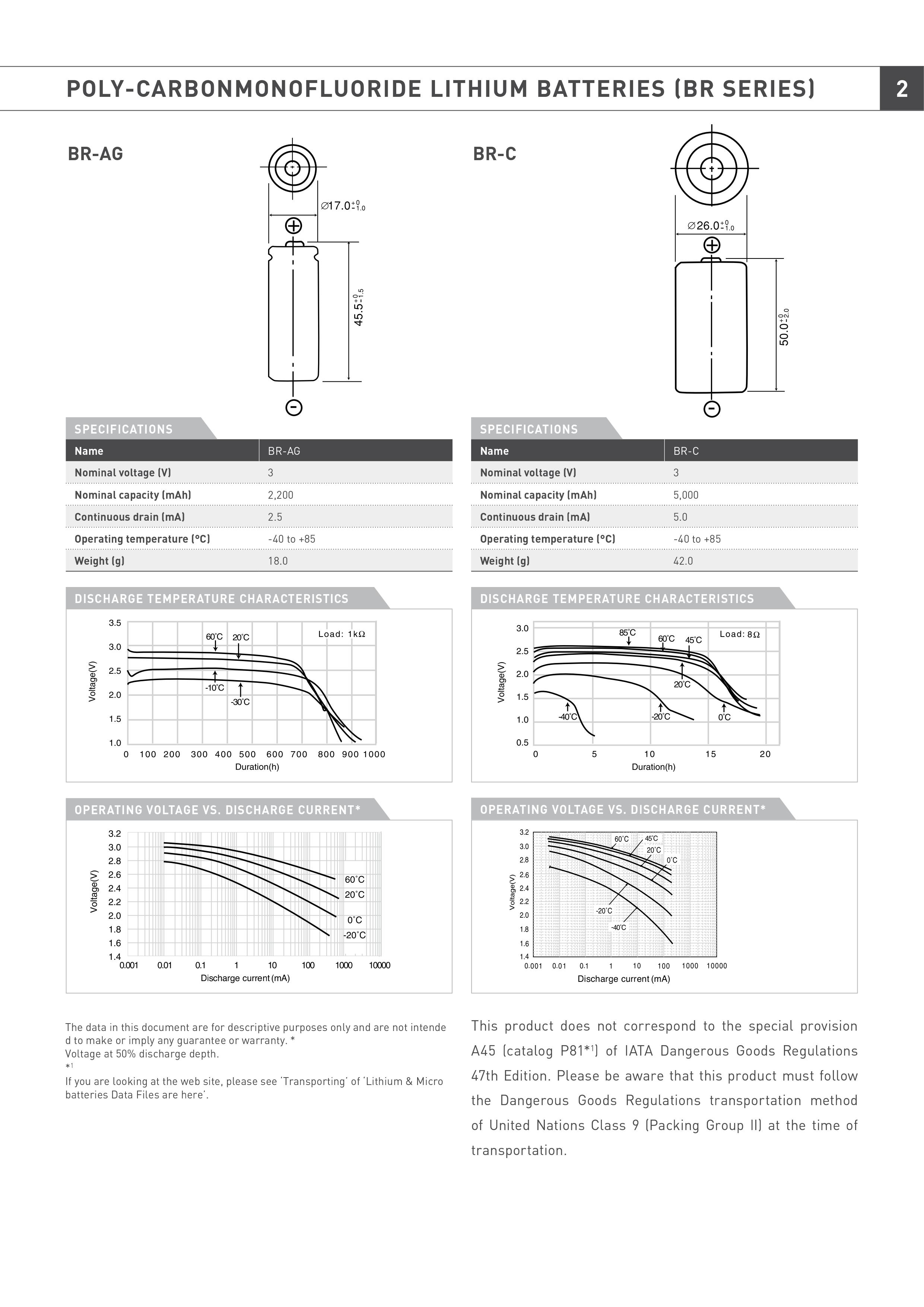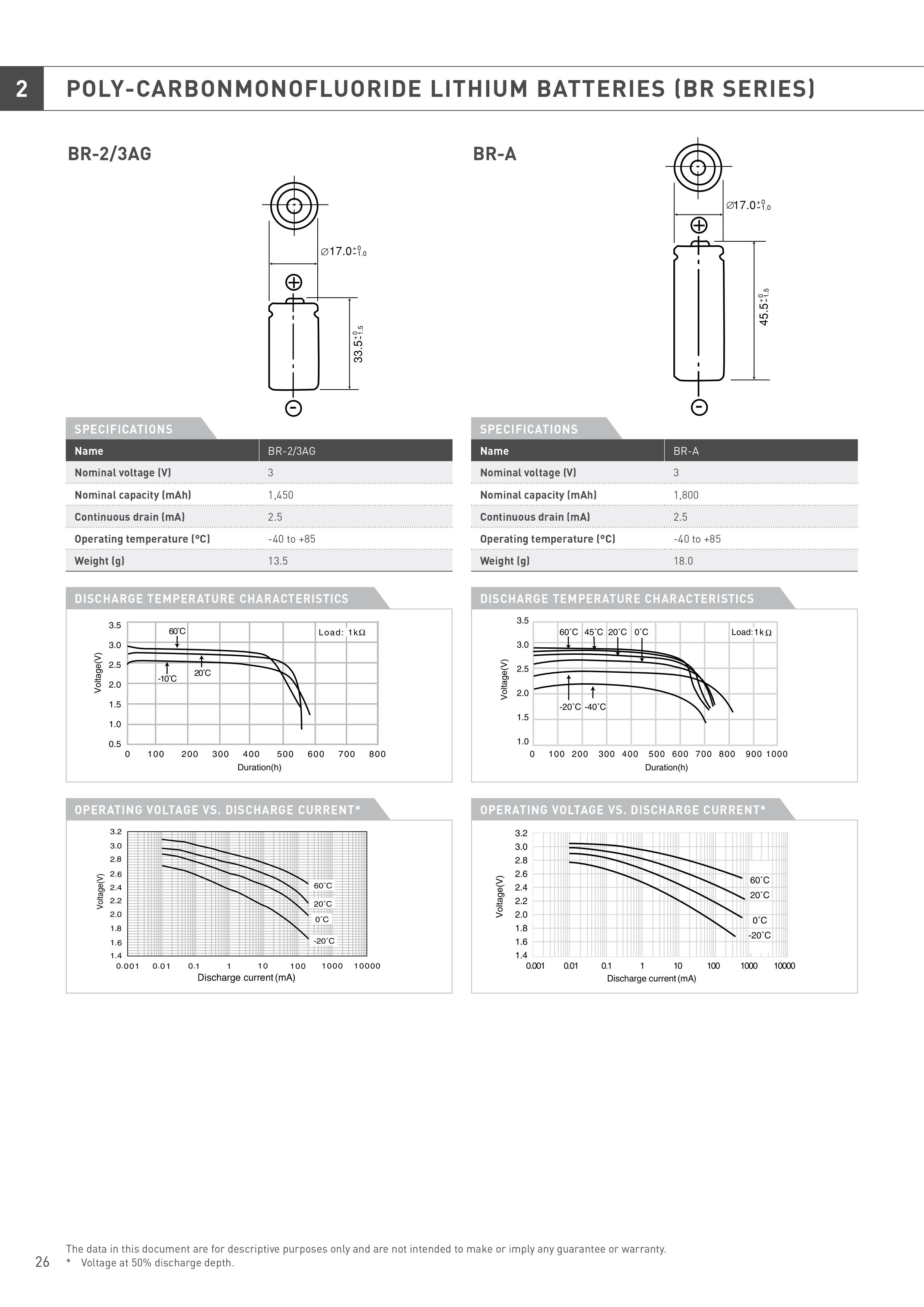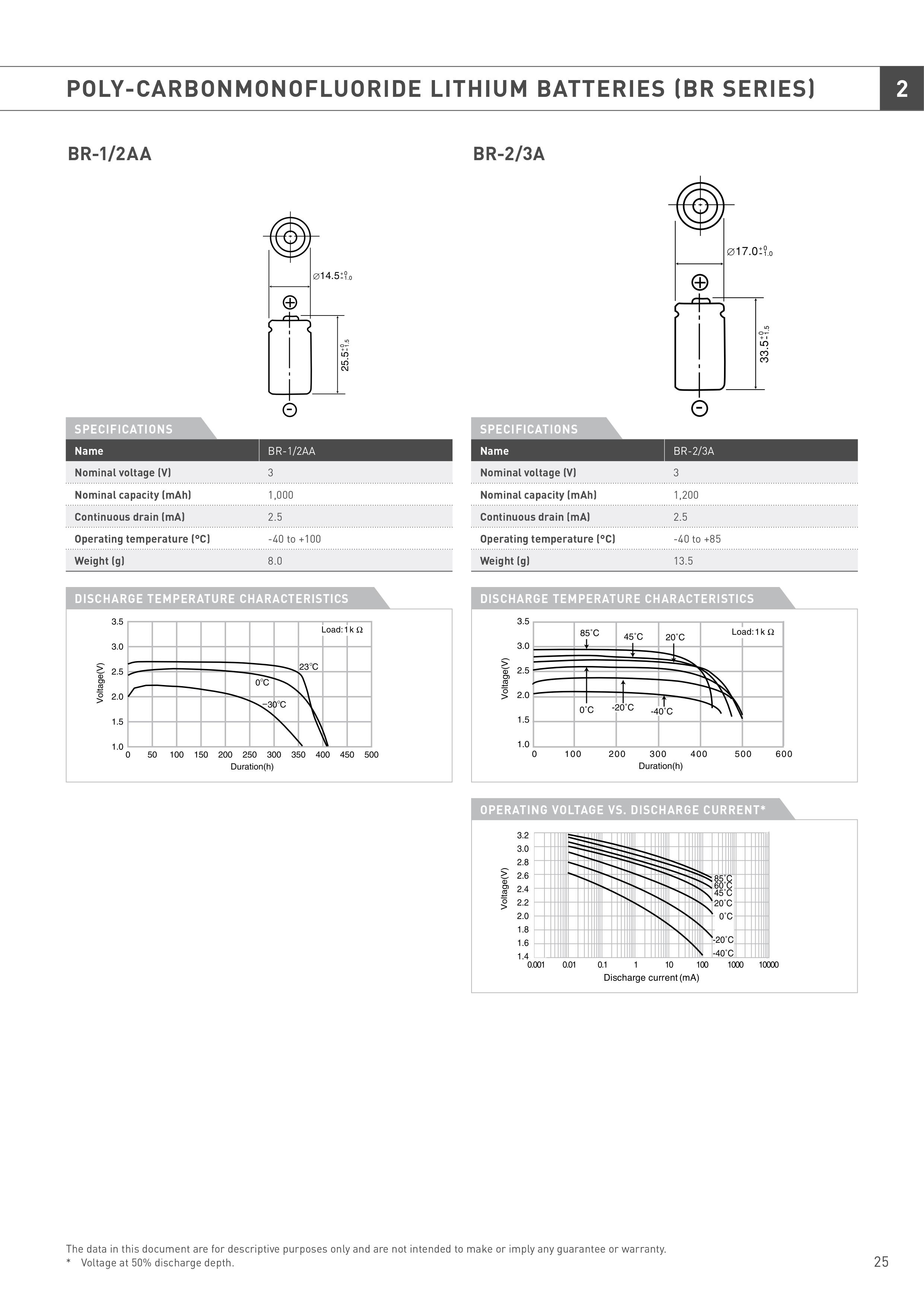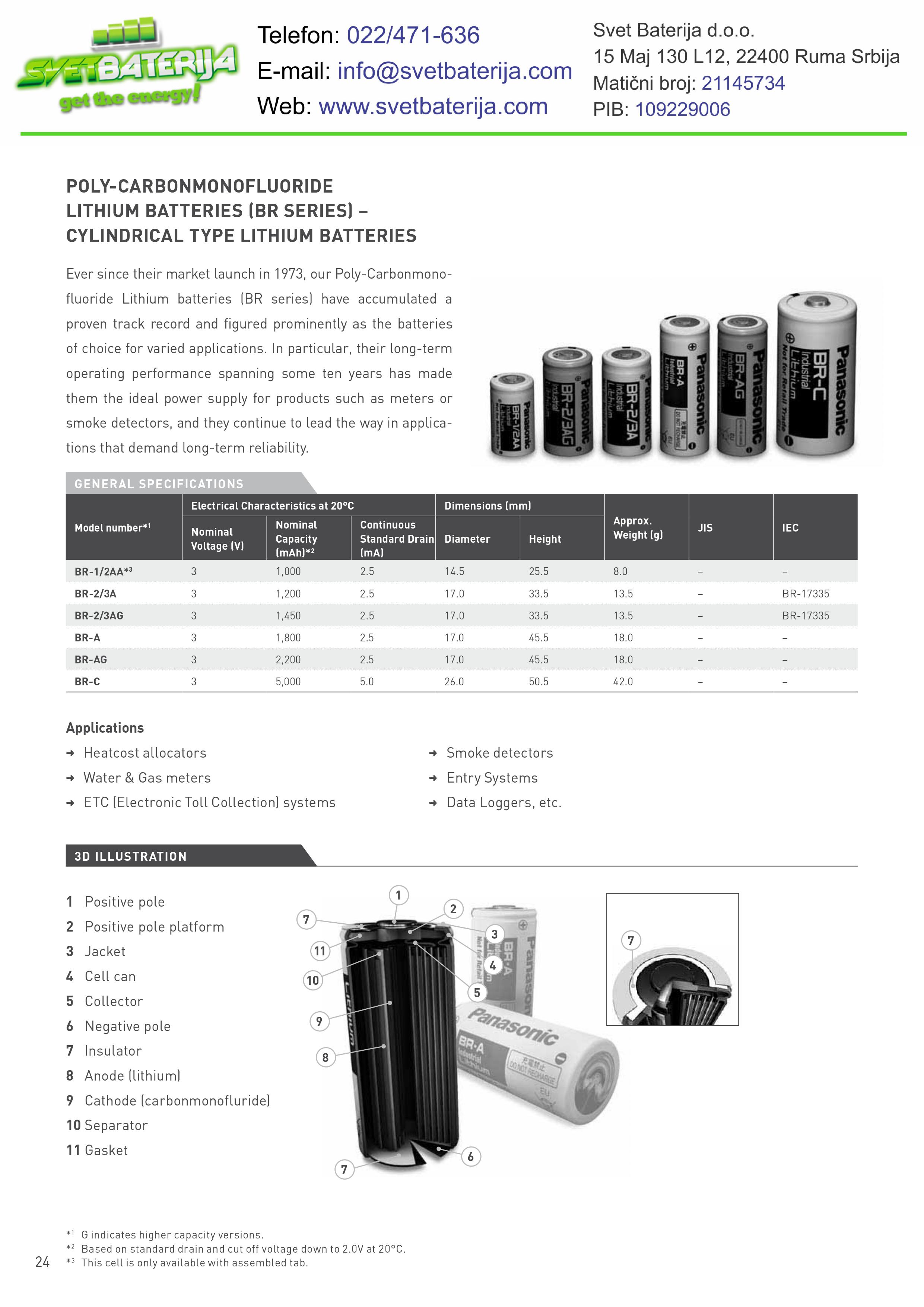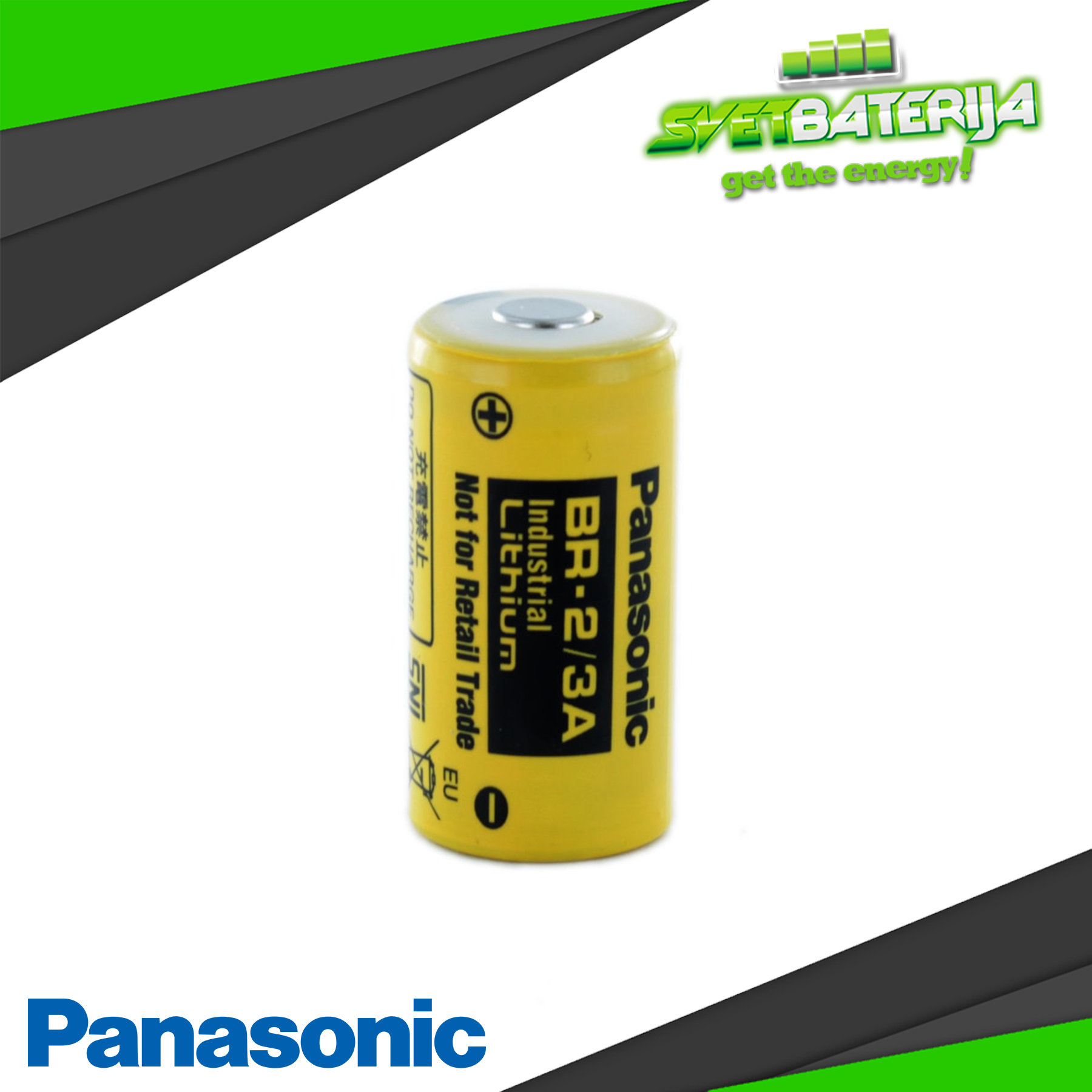 Panasonic BR-2/3A je cilindrična litijumska 3V baterija sa kapacitetom od 1200mAh. Hermetički zatvoreni terminali sprečavaju curenje baterije, a kontakti su takvi da je lako zalemiti pločice ili trnove. Ova baterija je idealna za sve vrste primene gde je cilj da se postigne što veća minijaturizacija. Pošto se mangan dioksid, koji je hemijski vrlo stabilan, koristi za pozitivan(+) terminal kao aktivni materijal, ukoliko su uslovi očuvanja pravilni, 90% kapaciteta baterije ostaje čak i nakon 10 godina skladištenja. Zapošljava organske elektrolite sa minimalnim pražnjenjem, tako da su izuzetno superiorni u smislu otpornosti na curenje pod promenama u okolini.