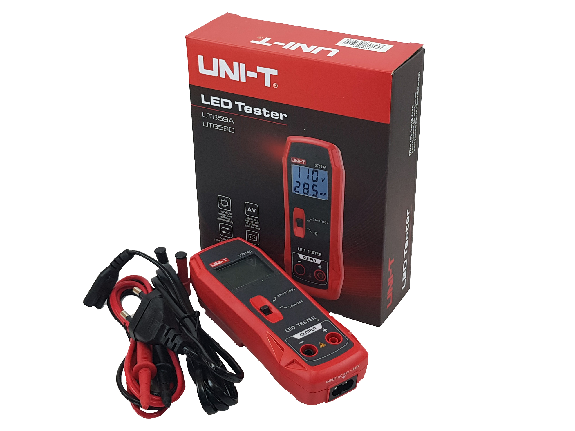 UT659D LED tester iz najnovije serije se već široko koristi i indistriji, koristi se za testiranje LED pojedinačnih dioda, inspekciji i popravci pozadinskog osvetljenja LCD televizora, LED traka, bilborda, LED reklama i drugih slični rasveta koje koriste LED diode. LED tester UT659D podržava napon 85V~265V, 50Hz/60Hz, prilikom testiranja dioda na 30mA/300V, polaritet diode se može automatski prepoznati, a izlazni napon je prilagodljiv potrošaču. UT659D je prekopotreban tester za proizvodnju LED reklama, bilborda, TV i LCD servise.